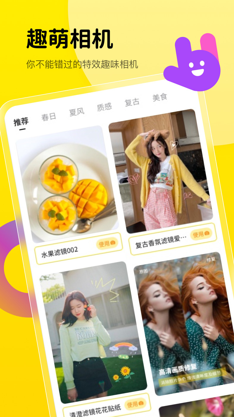 趣萌相机是一款非常好用的线上完成照片美颜和修图的软件,在这里用户们能够看到非常多的美图和特效都是可以直接添加的,有需要的用户们千万不要错过了,帮助用户们完成滤镜的转换和加强视觉效果等等,能够很好的满足用户们的使用需求等等,带来更多的惊喜,快来这里下载使用一下试试吧。