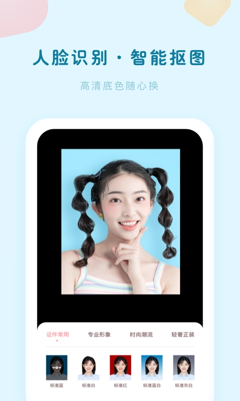 [自动裁切]证件照美颜大师应用程序基于行业领先的AI技术,可以自动识别背景裁剪并一键替换多个背景;