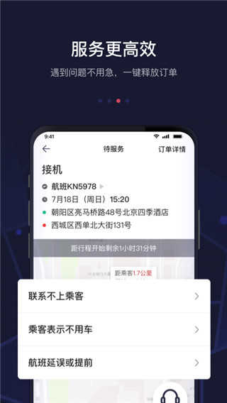 3、接驾高效:即时通讯,准确播报用户的实时位置,以便更快速准确的接到用户,给用户说曹操曹操就到的专车级体验。