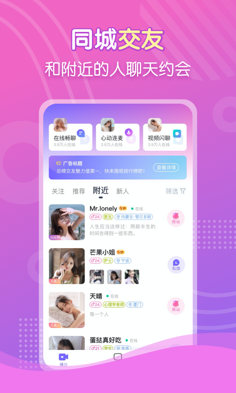 是附近的年轻人聊天约会软件,功能完善,用户真实,无任何的骚扰;