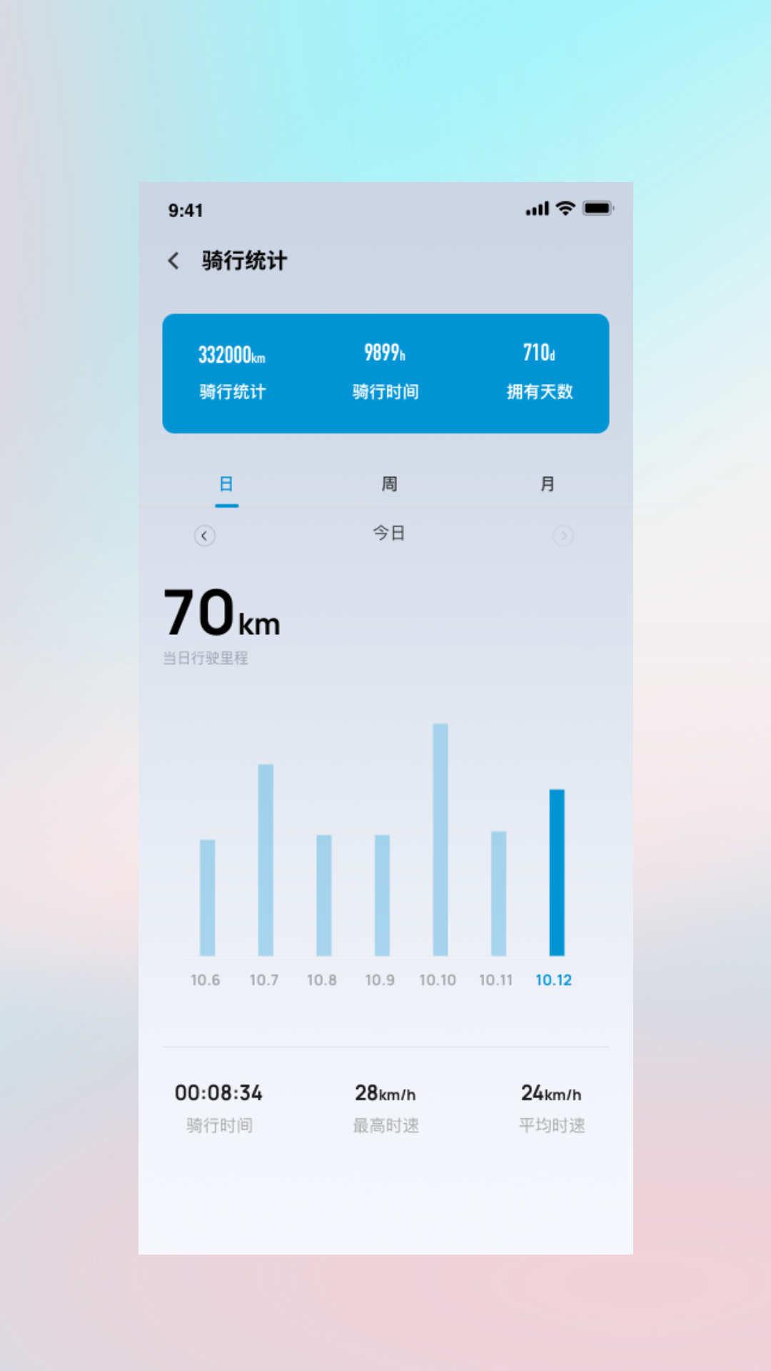 1、查看电池电量、续航里程、里程、骑行速度和仪表板的详细数据。