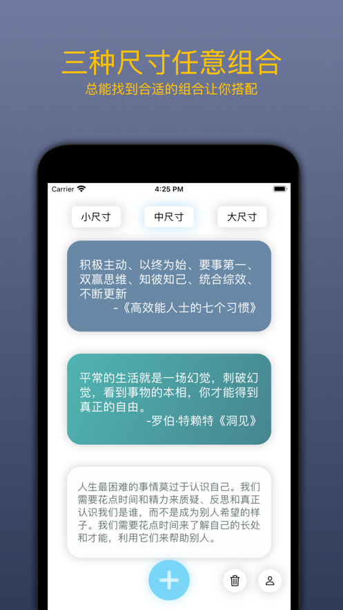 桌面金句App是一款可以根据个人喜好去自定义内容在桌面上的软件,软件功能非常不错,随时为自己获得更多优质的手机在线桌面排列帮助,自由度设置非常高,轻松设置模式,所有的文字风格都可以根据自己喜欢的风格进行设定。