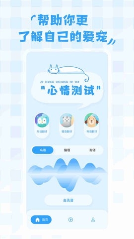 鸟语翻译器免费版是一款非常有趣且好用的动物语言翻译神器,该神器专为铲屎官们提供,可帮你轻松翻译鸟类、猫咪和狗狗的语言,让你轻松知心它们的想法。还能将你的声音翻译成它们的语言,让你们交谈无忧,快来试试吧!