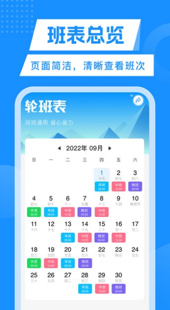 轮班表是为那些需要定期轮班工作的人所设计的一款日历应用程序,可以帮助用户计划和管理他们的轮班,以确保他们始终知道自己要在哪里工作,以及何时可以享受自己的休息日,提供了许多功能,例如用户可以轻松地在日历上添加和调整他们的轮班,设置提醒和闹钟来提醒他们何时要上班和下班。它还可以根据用户的喜好进行自定义,例如用户可以根据颜色、字体和主题来个性化他们的日历。