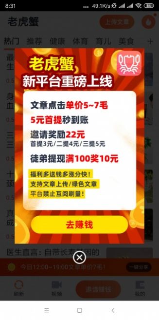 老虎蟹app是一款可以随时随地在线看最火爆资讯的手机赚钱软件,没有任何的限制条件,适合所有人。