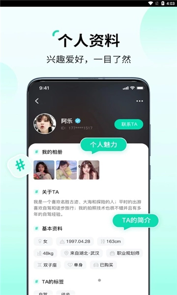 3、个人资料首页认证,兴趣爱好一目了然,让你随时随地发现身边智通达和的伙伴!
