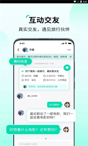 2、互动交友,真实身份认证,遇见旅行伙伴,天南海北随你闯荡,互相帮助快速升温;