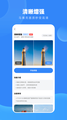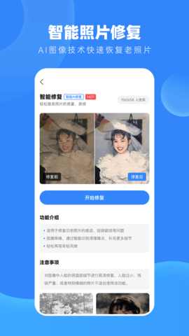 1、可以修复各种老旧、污渍、折痕等问题的照片,恢复照片的原本光彩,让照片变得更加清晰。