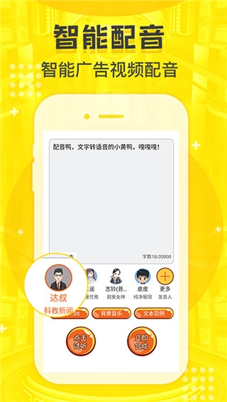 配音鸭app,掌上免费配音工具,支持一键轻松合成语音,让广告配音更轻松。多种音效任你挑选,使用简单,设置轻松,轻松获得满意配音。