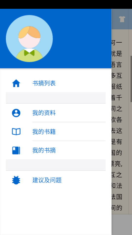 2.您可以点击左上角菜单,弹出个人中心, 点击“我的书摘”, 可以只浏览自己的书摘,此页亦提供删除功能。