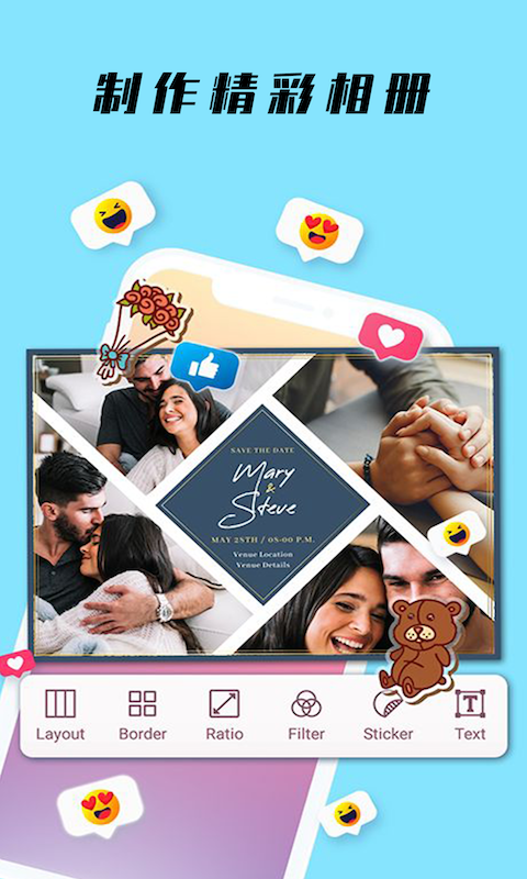 相框:数以百计的时尚框架布局让您选择难忘的独特艺术照片 编辑你的照片 贴纸:从500多个生动的贴纸中进行选择,这些贴纸分为纹身,皇冠,幽灵,动漫等主题,可以插入您的照片中。
