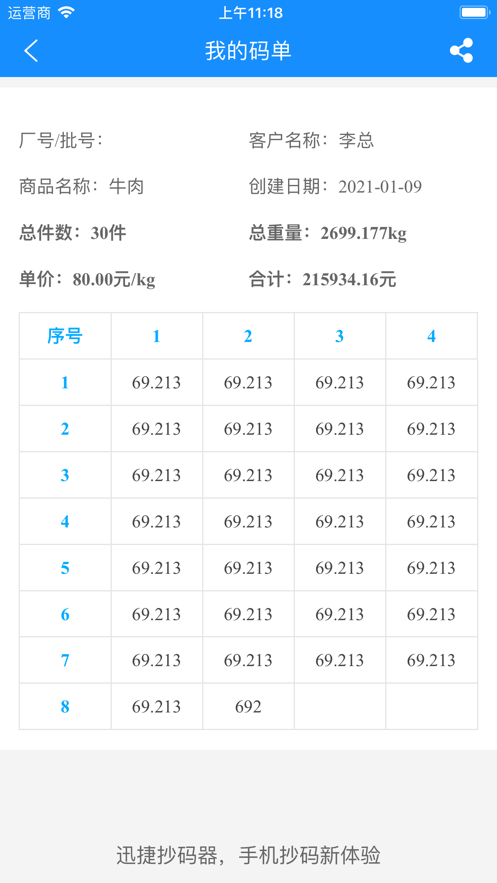 通过迅捷抄码器可以准确的记录每个商品的重量,记录完成后软件还可以对这些商品重量求和计算出总重量。