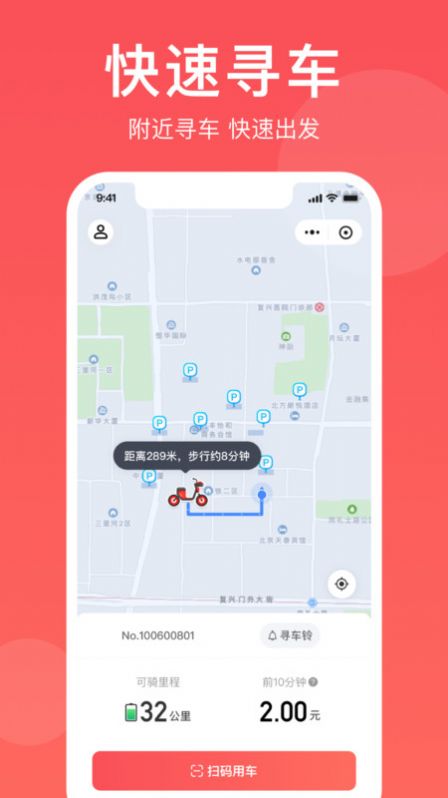 3、全程自助租车,用户无需进行人工认证过程,只需要注册并交纳一定押金,即可取用电动车共享出行。