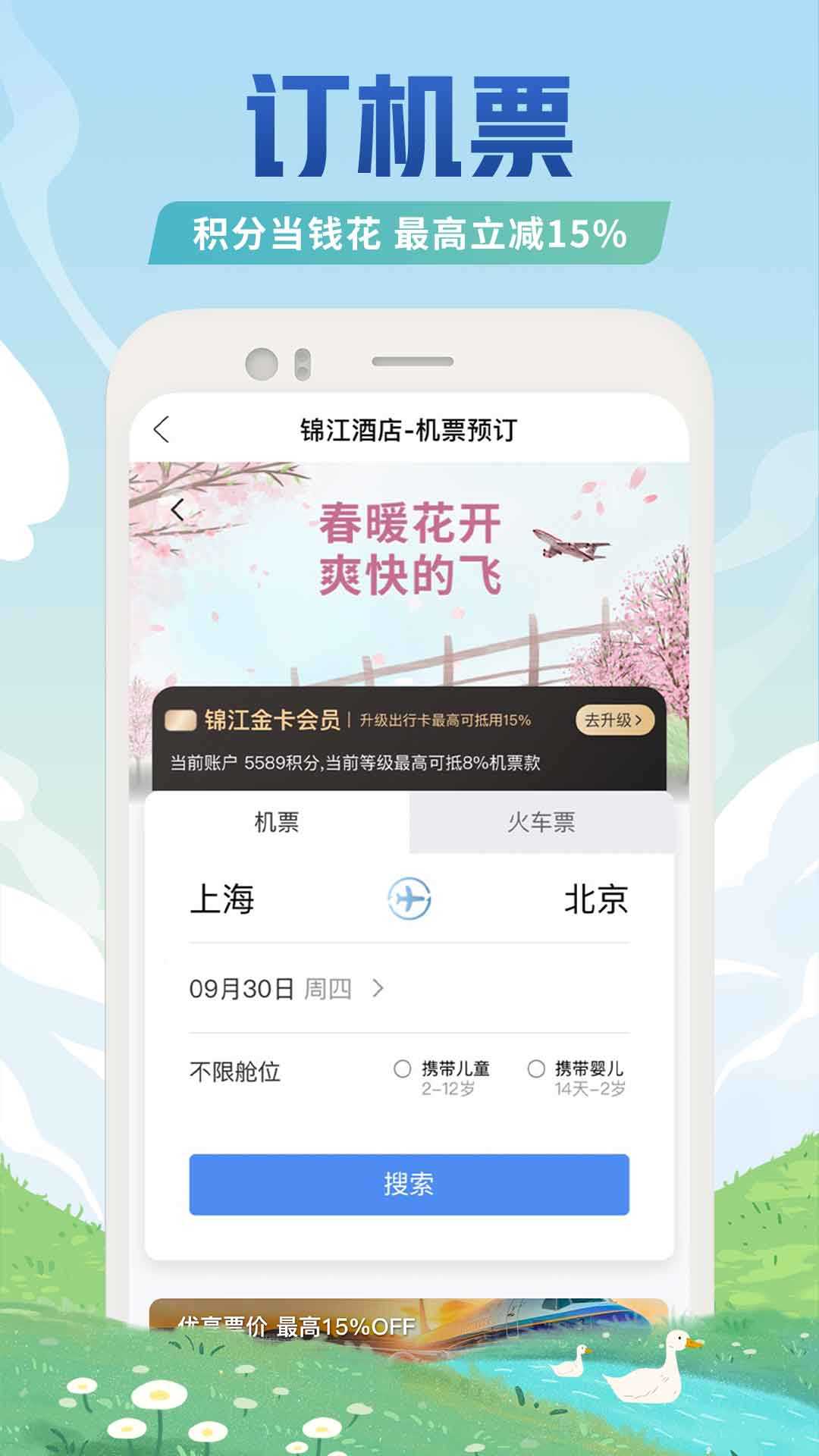 【锦江出行】机票预订、火车票预订已上线。积分更可当钱花,最高抵扣15%机票款。