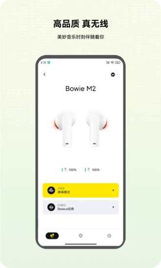 倍思蓝牙耳机app是一款配合倍思蓝牙耳机使用的应用程序。它可以让用户控制耳机的音量、音乐播放、通话、语音助手和其他设置。此外,该应用程序还提供了一些定制功能,例如耳机的EQ设置和自定义按键功能。倍思蓝牙耳机app还可以提供有关耳机电量和使用时间的信息,以及许多其他实用功能,使用户可以更好地管理他们的倍思蓝牙耳机。