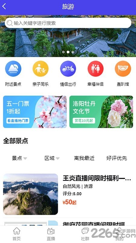 自驾游,用户在平台上可以查看景区门票信息,参与看直播免费领取门票