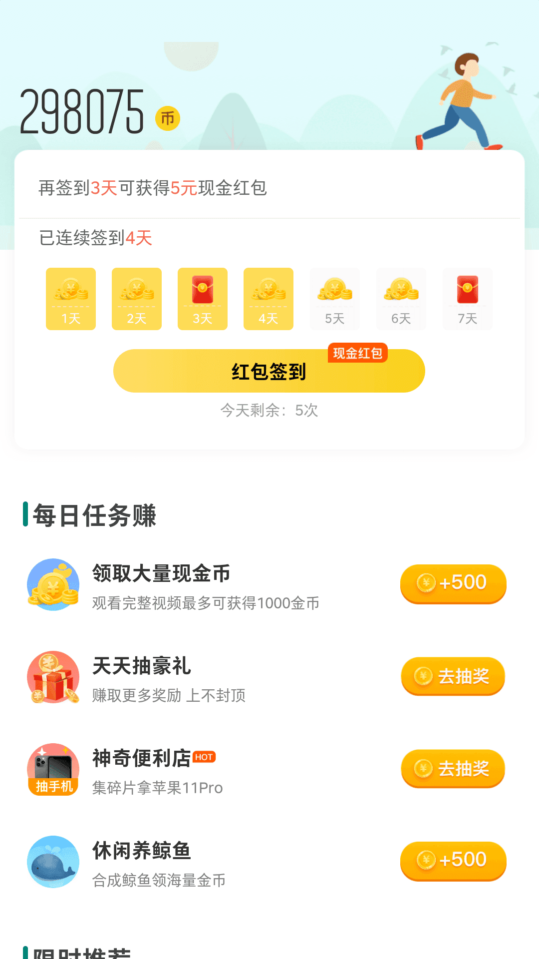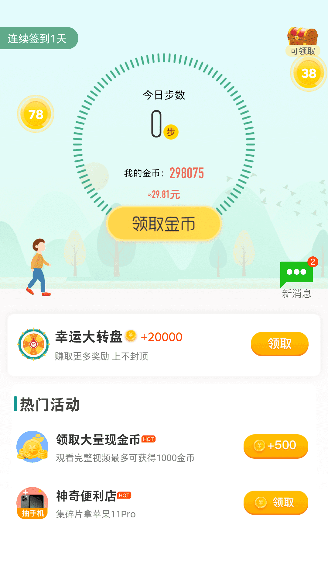 每天都可以将步数转换为金币兑换收益,立即提出;