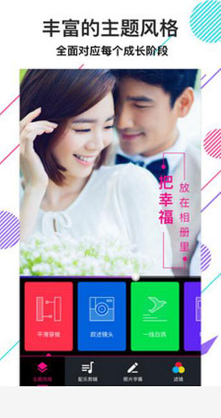 4、我们对于婚纱照,宝宝照,旅游照,朋友聚会,成长记录,自由旅行,微商,自拍等不同场景了针对性主题动效;每个转场与每个Scene的动画根据主题伴随着音乐的节奏来Design。