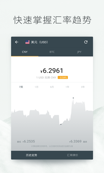 - 历史汇率:左滑显示 24 小时涨跌,支持 3 年价格回溯;