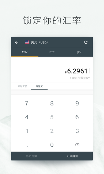 - 轻量交互,汇率主界面左滑呈现汇率行情,右滑切换目标货币;