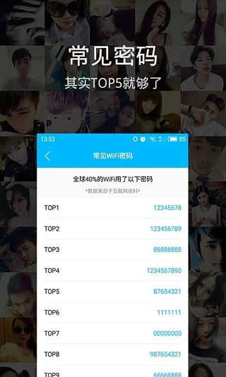 一把WiFi钥匙解锁亿万热点,让你体验360°免费WiFi,畅游互联网!看头条新闻,上QQ,聊微信,看优酷追韩剧,上爱奇艺追跑男,逛淘宝秒杀1元购。每天为你剩下N多流量,月底无需再向移动或电信加流量包!