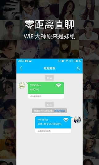WiFi伴侣手机版全新升级的社交功能带给你全新的体验。以场景为例,如果在一个公共的店中,想要连WiFi,WiF伴侣把知道密码的人介绍给你,可以跟他们问密码,有一些知道密码的大神在沟通之后,就可以告诉你密码,可以轻松实现上网,而且还可以交到一些有趣的朋友!