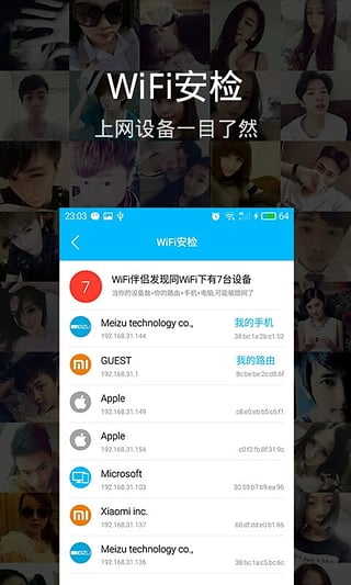 WiFi伴侣做你的监测管家,内置WiFi监测保障功能,一键检测:是否可以正常访问互联网;DNS服务器食是否正常;是否存在ARP欺骗攻击;是钓鱼网否;是虚假WiFi否。上网,为你护航!