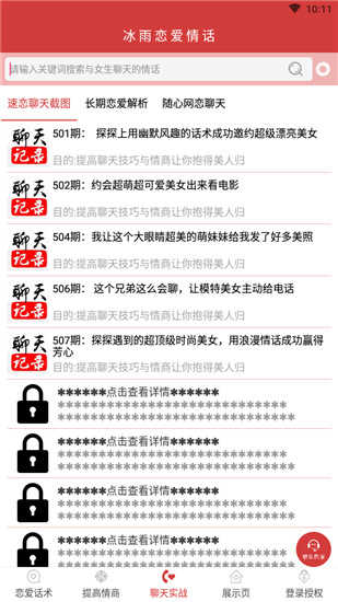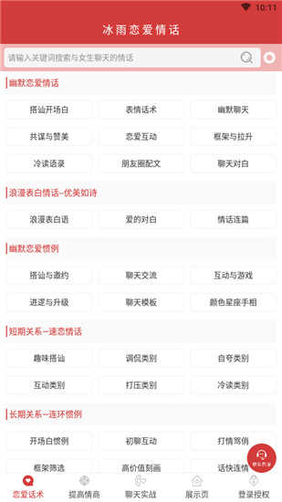 冰雨话术是一款非常实用的恋爱话术教学app,为您提供了海量有趣的聊天技巧,约会技巧,你再也不用担心聊天会冷场,冰雨话术app涵盖了十分丰富的聊天话题,还有各种话术,有需要的用户们快来下载冰雨话术app体验吧!