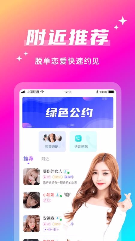 2、【同城约会】同城交友,自由选择线上高颜值妹子比心视频聊天一周处cp,附近线上交友聊呗,线下见面约会,带你进入恋爱空间。发现附近有趣的灵魂伴侣,告别单身。