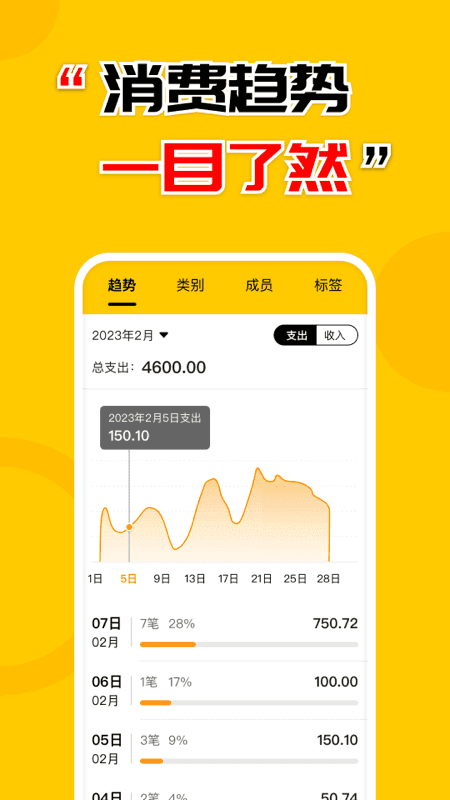 消费趋势:一目了然的图表,帮你快速分析消费情况,知道钱都花在哪儿了;