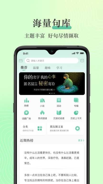 海量文案素材:句子控拥有数万条文案素材,且不断更新,用户可随时获取最新的文案灵感。