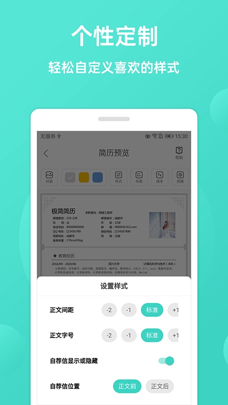极简简历app是一款实用的简历制作APP。在极简简历app内,很多不同的类型的风格的素材,不同的模板与排版都可免费享用,用户可以轻松的编辑自己的简历,方便又快捷。功能服务非常全面,可以自定义进行添加项目,简历更丰富。