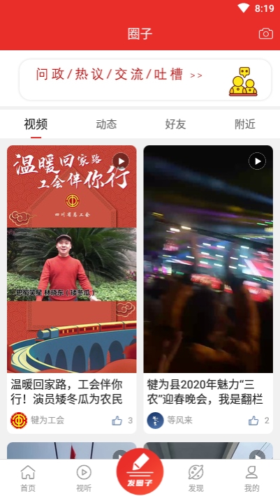 2、丰富的发圈子内容栏目,上面设置了视频、动态、好友以及附近划分栏目;
