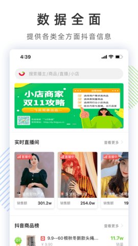 飞瓜数据app是一个抖音全场景数据分析平台,从多个维度来实时监控直播,发掘各种爆款的商品,通过该平台还可以了解各种素材和热点榜单,助力粉丝多账号的运营,实时掌握旗下账号的新动向。