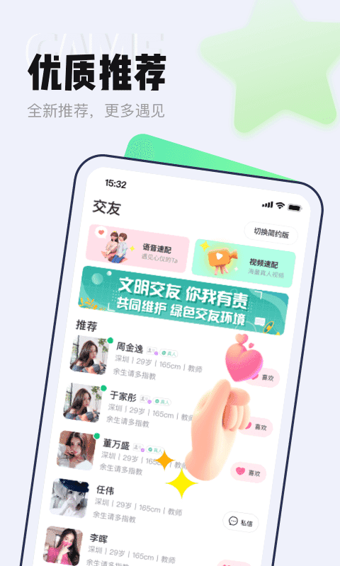交友神器:海量主播实时在线,真人认证,拒绝虚假照片现象!遇见心动的Ta马上开聊!