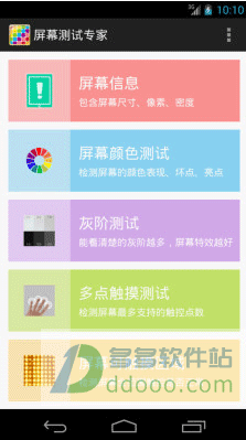 屏幕测试专家app专业的手机屏幕检测功能,还可以检测屏幕颜色、屏幕灰阶、多点触摸,还能检测出旧手机的老毛病,就能够一键检测该板块的数据信息,用户只需通过手指触碰需要检测的区域,DPI值等,来下载检测一下屏幕的好坏吧。