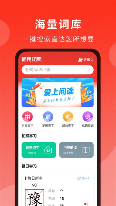 3、支持照片扫描识别查询汉字,朗读汉字,真实发音,快速学习发音。
