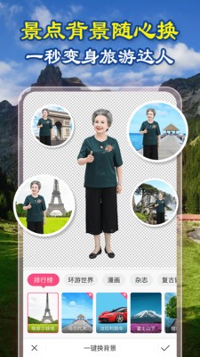 抠图换背景,秒变旅游达人,足不出户,全球美景自拍尽在掌控。