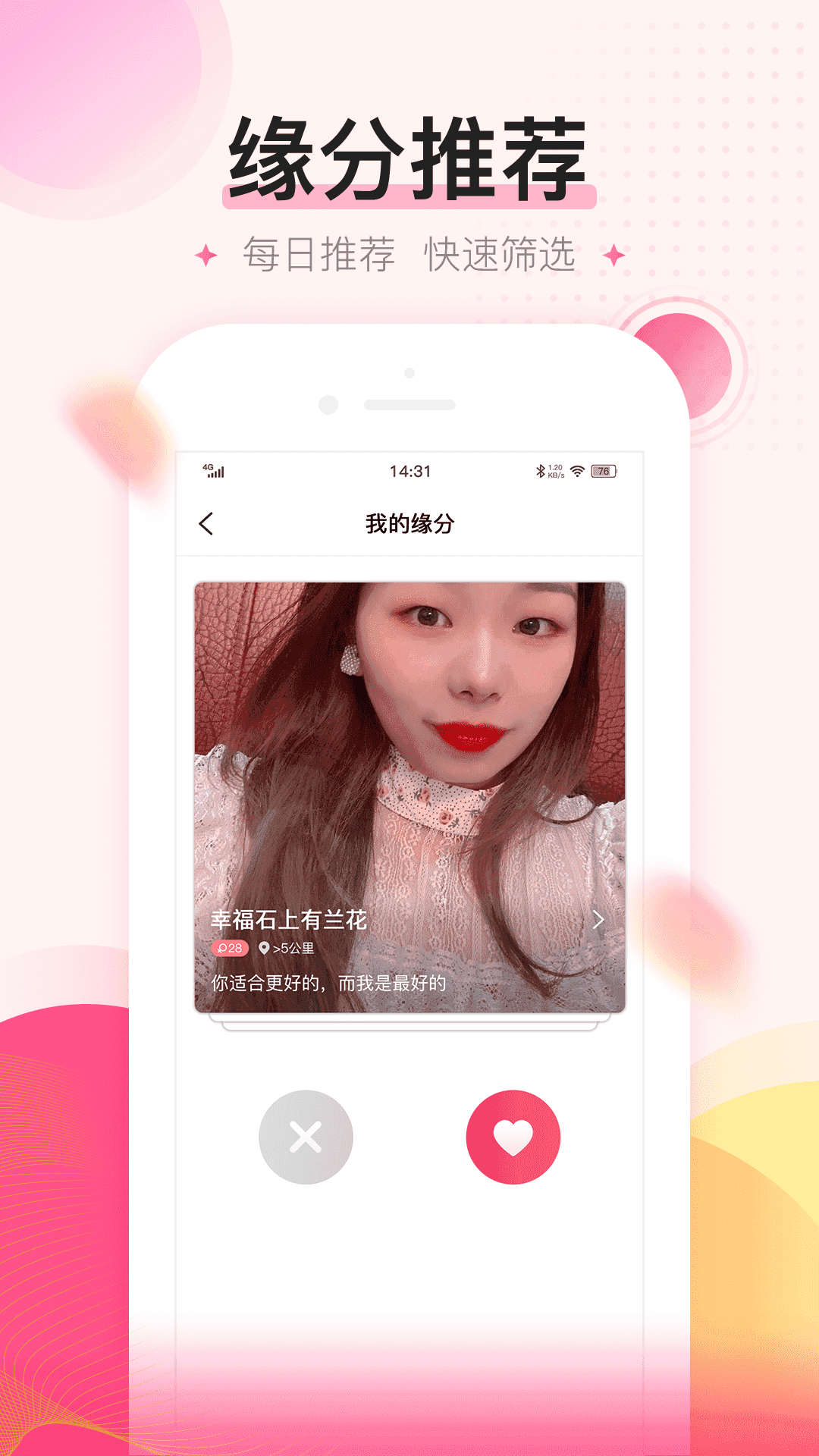 2.这是一个非常好的移动交互约会平台,可以为每个人创建一个更方便的在线约会社区,定时推荐附近、同城在线寻爱的单身与您聊天交友,助您觅得真爱,找到合适自己的有缘人。