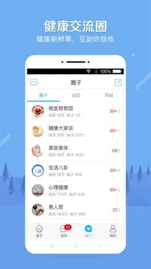 7、健康圈子:健康交流社区,与同科室、同疾病的病友及医生进行互动,不定期邀请知名专家参与互动;