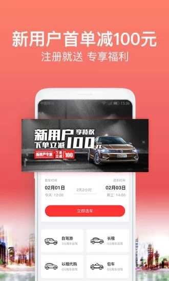 【新手福利】:现在租车,优惠多多,新用户租车首单减100元,几十元即可租到心仪的车。