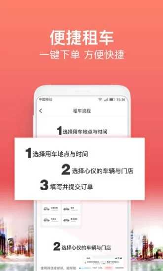 【便捷租车】:全流程移动互联网体验,APP一键下单,无需额外流程,全城免费取送车。