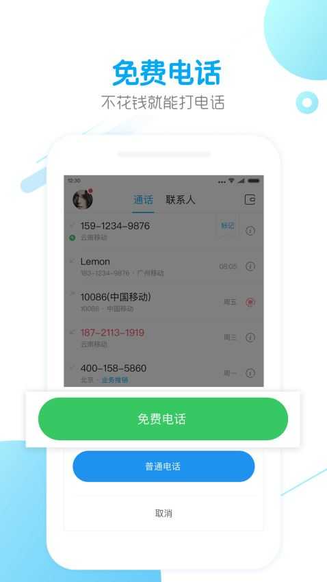 无需注册,WIFI或3/4G下可免费打电话,对方没装没联网也能打,去电显号,高清音质。无需付费充值,永久免费