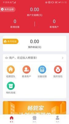 畅管家app是为用户为用户推荐的一款商户数据管理服务的软件用户可以在平台上查询自己和直营商户的业绩登录后即可一键查看团队、商户、设备情况、钱包等,服务包括组建团队,这些功能服务都是非常灵活的,让你对自己的收益了如指掌。