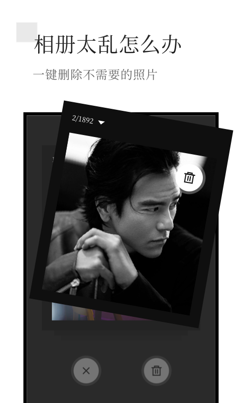 - 简单手势操作,往左、往右、选择相册,轻松实现删除、保存、分类。