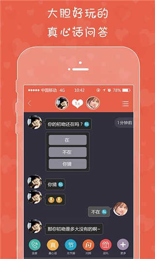 4、真心话、无节操、情侣游戏、你画我猜、闪照等会打消双方初次相遇的尴尬,完成恋爱清单,双方就可修成正果成为甜蜜情侣;