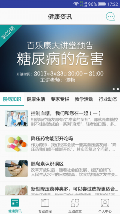 2.可以在线学习教材式工具化的慢性病为基础,会以病种为分类系统的定期或不定期的公共讲堂为辅助,让用户结合实际案例在线测评。