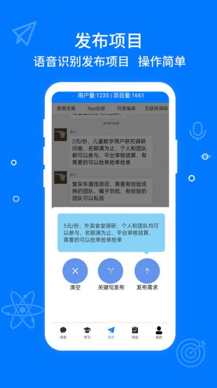 1、用户可以通过平台提供的定制需求功能来发布自己的项目需求,吸引更多适合的人进行联系;