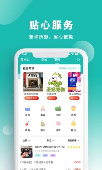 1、利用当前定位信息,迅速搜索附近的宠物商家,浏览并选择心仪的宠物