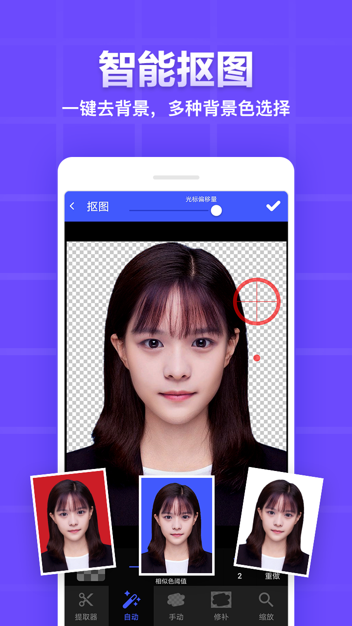 支持自拍模式,拍到你满意为止。快速添加男女正装衣服,一键美颜,即可告别丑丑的证件照。还可快速换底色,一键操作,方便简单。